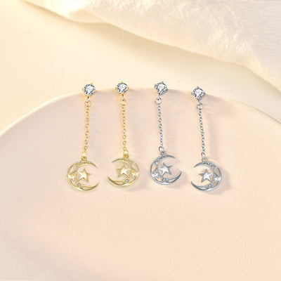 Beautiful Hollow CZ Crescent Moon Stars 925 Sterling Silver Dangling Earrings
