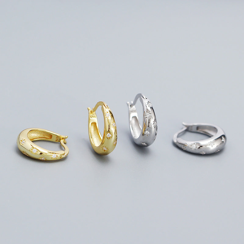 Hot Shining CZ Eight Pointed Stars 925 Sterling Silver Hoop Earrings