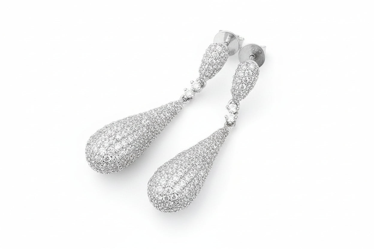 Stunning elongated teardrop earrings featuring micro-pavé cubic zirconia. 925 sterling silver base with luxurious 18K white gold plating for a platinum-like finish.